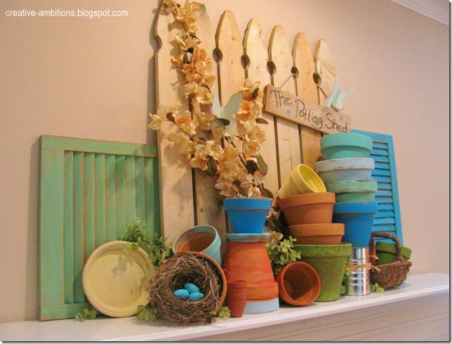 I really like the multi-colored pots on the mantel--that along with the bright shutters make for a happy spot in your living room, I am sure!