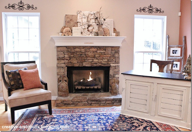 First, I moved our “too small of a rug for our living room” over in front of the fireplace which now has my new Winter Mantel display on it.